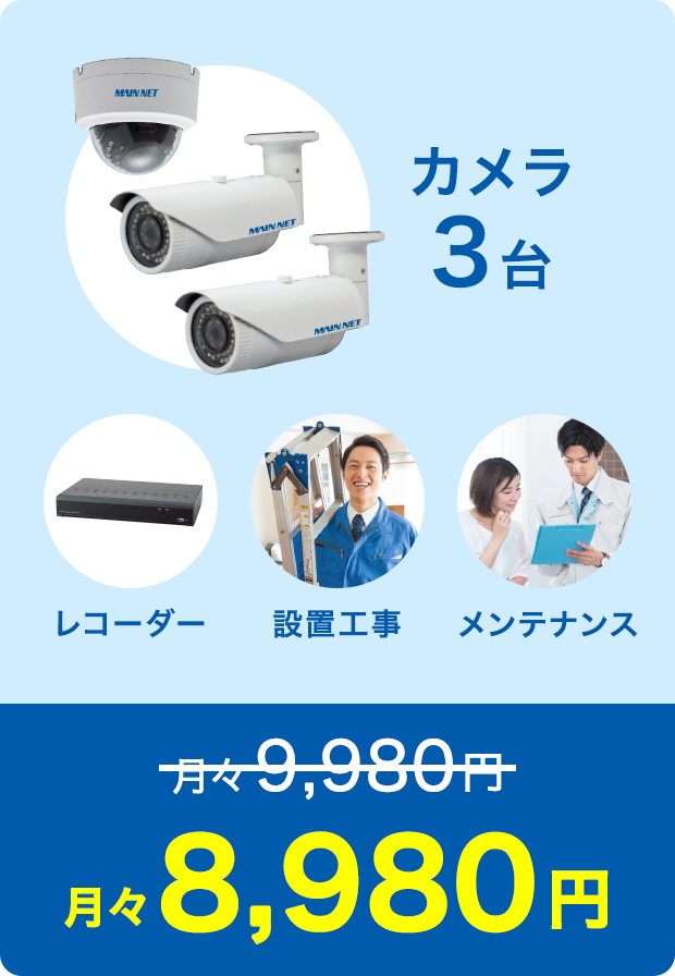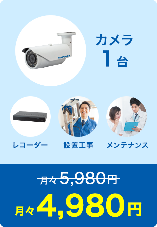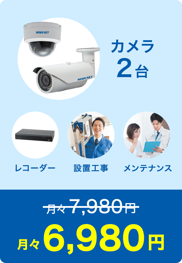 カメラ1台(200万画素)、レコーダー1台(2TB)、工事費(カメラからレコーダーまでの配線、距離10M内)